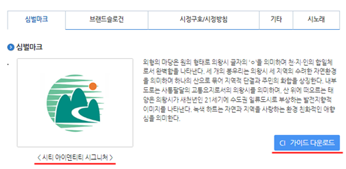 ‘시티’는 ‘도시’로, ‘아이덴티티’는 ‘정체성’으로, ‘시그니처’는 ‘표지’로 각각 다듬을 수 있는 말입니다. 우리말로 대체가 가능한 단어는 다듬어 사용하기를 권장하고 있습니다. 마찬가지로 ‘가이드 다운로드’ 또한 ‘안내서 내려받기’로 다듬을 수 있습니다.